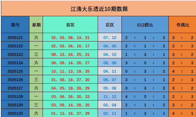 0路号码,近10期显露较热,0路开出18个奖号,上期出号1枚,本期瞻望出号不变,推选存眷0路奖号33。 1路号码,近10期显露较冷,1路开出16个奖号,上期出号3枚,本期瞻望出号不变,推选存眷1路奖号01,10,16。 2路号码,近10期显露较冷,2路开出16个奖号,上期出号1枚,本期瞻望出号不变。推选存眷2路奖号23。 前区奇偶分析:上期红球开特等数4个,偶数1个,奇偶比4:1,近10期奇偶比28:22,奇数走势占优,本期瞻望奇偶比3:2 后永别析: 上期后区开出2路2路号码02,11。近10期012路比4:7:9,2路号码占优。本期预测后区开出2路2路号码05,08